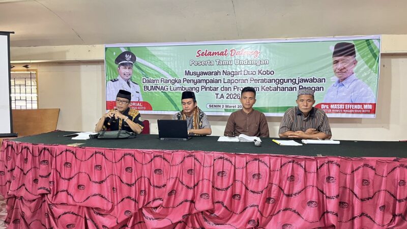 Kegiatan tersebut berlangsung di Aula Nagari Duo Koto pada Senin, 2 Maret 2025. Musyawarah ini sekaligus menjadi forum evaluasi kinerja BUMNag serta penentuan arah pengembangan usaha ke depan. Pelaksanaan Kegiatan ini merupakan salah satu amanah PP 11 tahun 2021 tentang Badan Usaha Milik Desa, yang sekaligus merupakan forum pengambilan keputusan tertinggi dalam BUMNag.