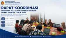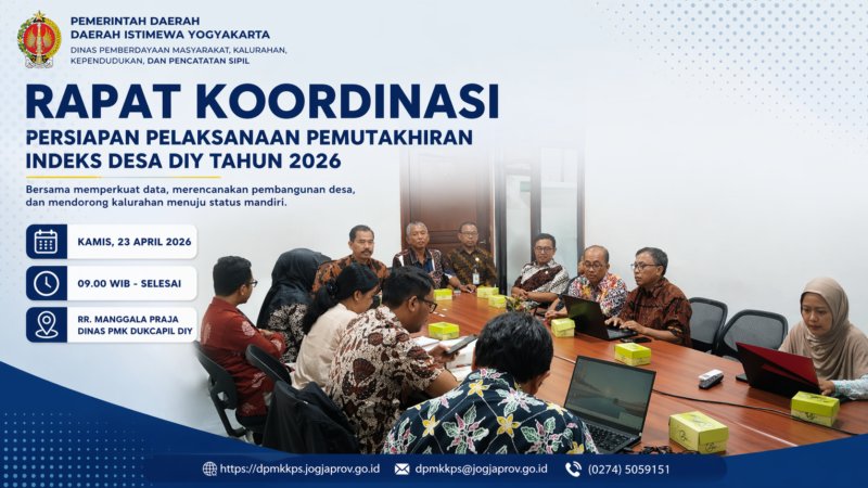 Komitmen tersebut ditandai dengan pelaksanaan rapat koordinasi dan persiapan pemutakhiran Indeks Desa yang digelar pada Kamis, 23 April 2026, di Ruang Rapat Manggala Praja DPMK Dukcapil DIY. Kegiatan ini melibatkan berbagai pemangku kepentingan, mulai dari unsur pemerintah provinsi, kabupaten, hingga Tenaga Ahli Pemberdayaan Masyarakat (TAPM).